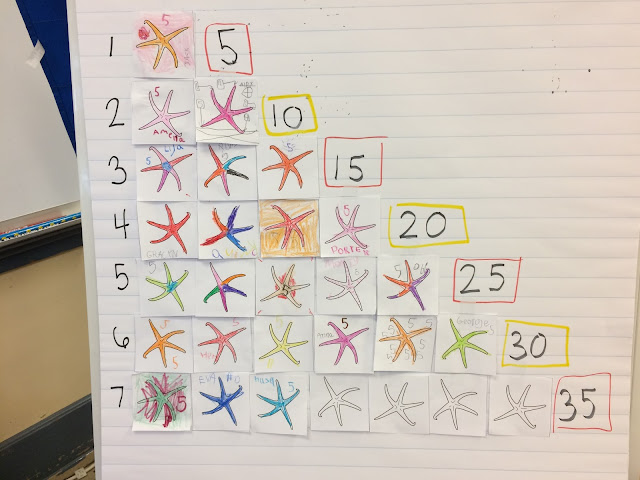This week we continued to learn more ideas about math. We worked together to make a chart of counting by 10's and 5's. Many of the young mathematicians are familiar with counting by 5's and 10's, but we still cover the concept as a class at least once to make sure everyone has a chance to be reminded of strategies, learn the idea for a the first time, or share their good math ideas with others. Ask your child to count by 5's and 10's for you!